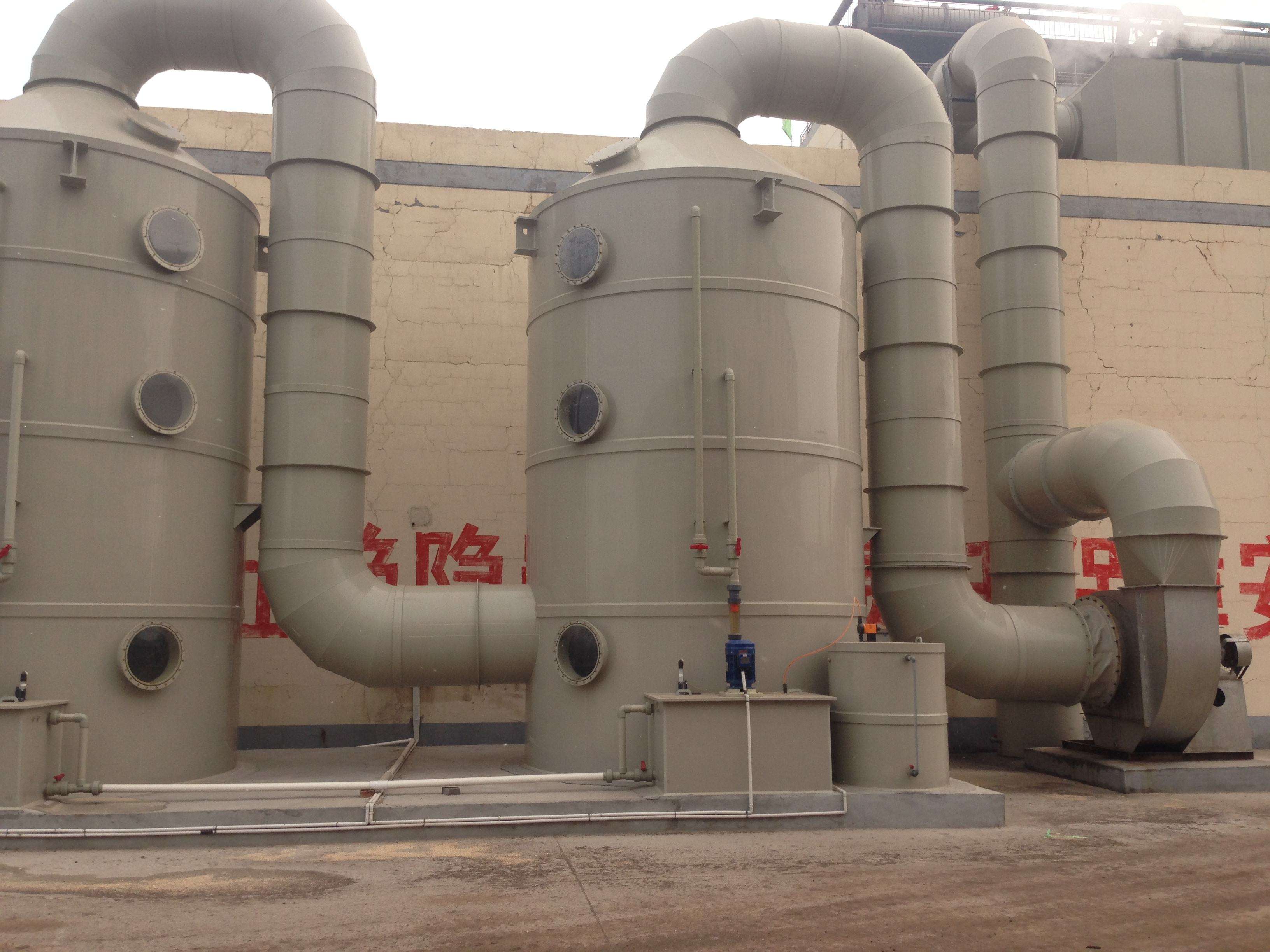 煙氣經(jīng)布袋除塵器除塵,再進(jìn)入脫硫塔。煙氣在脫硫塔內(nèi)與脫硫液接觸,將脫硫液霧化成直徑0.1-1.0mm的液滴,形成良好的霧化吸收區(qū)。煙氣與脫硫液中的堿性脫硫劑在霧化區(qū)內(nèi)充分接觸反應(yīng),完成煙氣的脫硫吸收和進(jìn)一步除塵。經(jīng)脫硫后的煙氣向上通過塔側(cè)的出風(fēng)口直接進(jìn)入風(fēng)機(jī)并由煙囪排放。